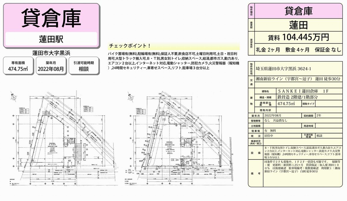 埼玉県蓮田市黒浜3624-1の貸倉庫・貸工場・賃貸土地を探すなら中小企業を応援する埼玉貸倉庫.comでニーズに合った物件を検索してください。埼玉県蓮田市黒浜3624-1の事務所付貸倉庫、クレーン付、店舗倉庫、工業専用地域等、何なりと営業担当者にお申し付けください。その他、埼玉県蓮田市黒浜3624-1の貸し倉庫・貸し工場・賃貸土地を貸したい方には無料にて査定・掲載いたしますので当社のオーナーサポートシステムをご利用ください。埼玉県蓮田市黒浜3624-1で貸倉庫・貸工場・賃貸土地を契約のテナント様には貸し倉庫・貸し工場の設計変更、造作のご相談も承ります。貸倉庫・貸工場・賃貸土地の移転・新規開設は埼玉エリア最大級、新着情報満載、埼玉貸倉庫.com! |