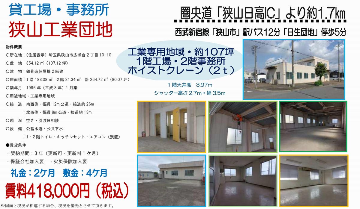 埼玉県狭山市広瀬台2-10-10の貸倉庫・貸工場・賃貸土地を探すなら中小企業を応援する埼玉貸倉庫.comでニーズに合った物件を検索してください。埼玉県狭山市広瀬台2-10-10の事務所付貸倉庫、クレーン付、店舗倉庫、工業専用地域等、何なりと営業担当者にお申し付けください。その他、埼玉県狭山市広瀬台2-10-10の貸し倉庫・貸し工場・賃貸土地を貸したい方には無料にて査定・掲載いたしますので当社のオーナーサポートシステムをご利用ください。埼玉県狭山市広瀬台2-10-10で貸倉庫・貸工場・賃貸土地を契約のテナント様には貸し倉庫・貸し工場の設計変更、造作のご相談も承ります。貸倉庫・貸工場・賃貸土地の移転・新規開設は埼玉エリア最大級、新着情報満載、埼玉貸倉庫.com!