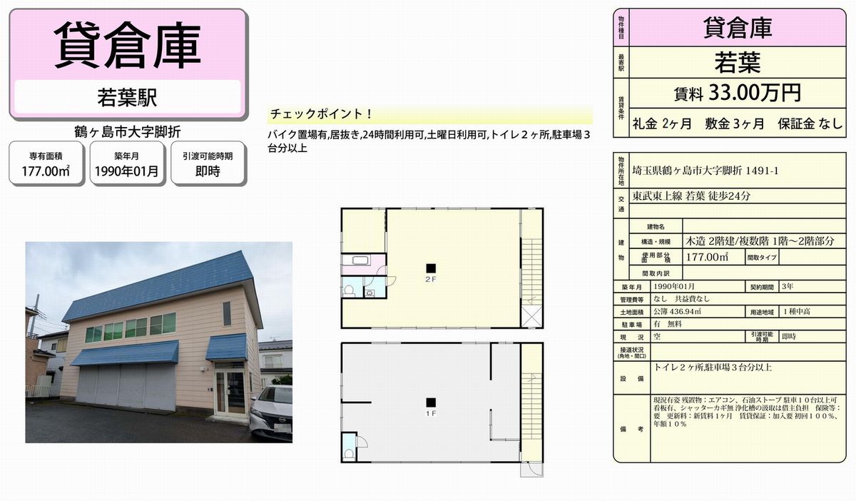 埼玉県鶴ヶ島市脚折1491-1 (若葉) 若葉 倉庫 詳細データ