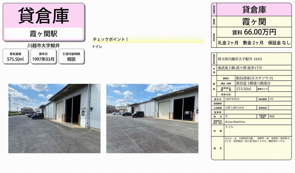 埼玉県川越市鯨井1643 (霞ヶ関) 粕谷倉庫 詳細データ