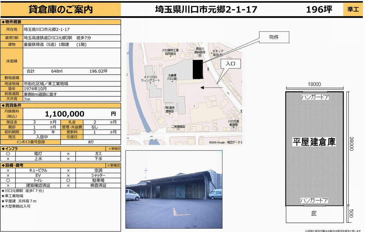 埼玉県川口市元郷2-1-17の貸倉庫・貸工場・賃貸土地を探すなら中小企業を応援する埼玉貸倉庫.comでニーズに合った物件を検索してください。埼玉県川口市元郷2-1-17の事務所付貸倉庫、クレーン付、店舗倉庫、工業専用地域等、何なりと営業担当者にお申し付けください。その他、埼玉県川口市元郷2-1-17の貸し倉庫・貸し工場・賃貸土地を貸したい方には無料にて査定・掲載いたしますので当社のオーナーサポートシステムをご利用ください。埼玉県川口市元郷2-1-17で貸倉庫・貸工場・賃貸土地を契約のテナント様には貸し倉庫・貸し工場の設計変更、造作のご相談も承ります。貸倉庫・貸工場・賃貸土地の移転・新規開設は埼玉エリア最大級、新着情報満載、埼玉貸倉庫.com!
