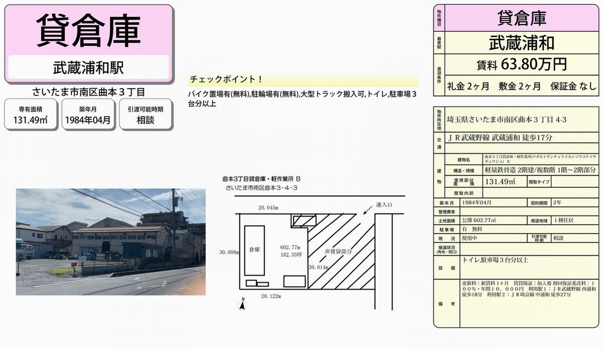 埼玉県さいたま市南区曲本3-4-3 (武蔵浦和) 武蔵浦和 倉庫B 詳細データ