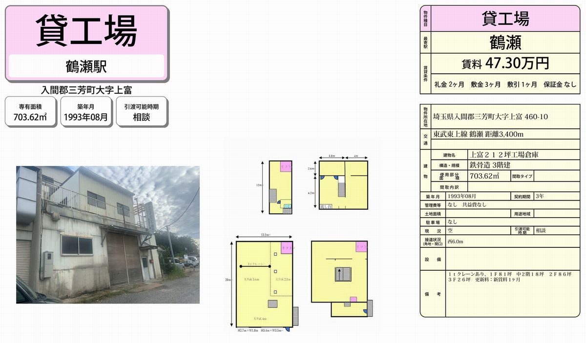 埼玉県入間郡三芳町上富460-10 (鶴瀬) 鶴瀬 工場 詳細データ