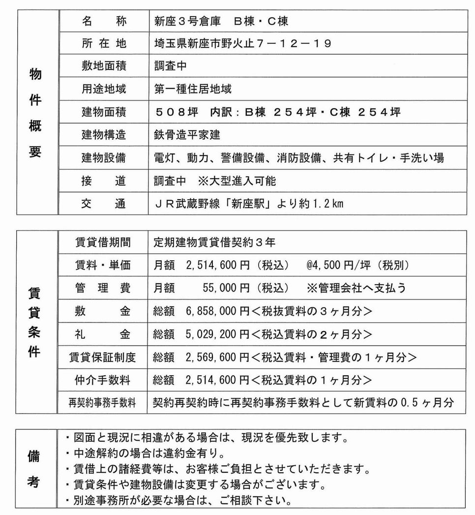 埼玉県新座市野火止7-12-19 (新座) 新座3号倉庫B+C棟 詳細データ