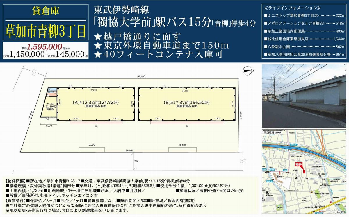 埼玉県草加市青柳3-28-17 (松原団地) 獨協大学前 倉庫 A+B一括貸 詳細データ