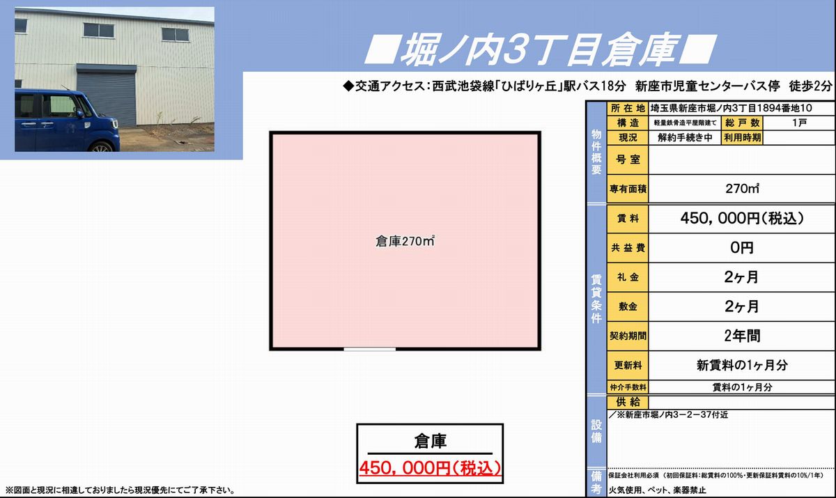 埼玉県内の貸倉庫・貸工場・賃貸土地の情報満載(トップ) > 埼玉のエリアで探す > 新座市 > ひばりヶ丘 > 新座市堀ノ内3-1894-10 堀ノ内3丁目倉庫