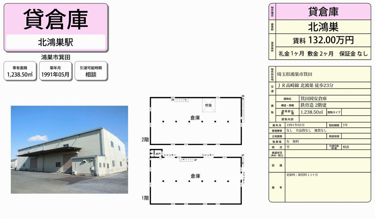埼玉県鴻巣市箕田3410-1 (北鴻巣) 岡安倉庫 詳細データ