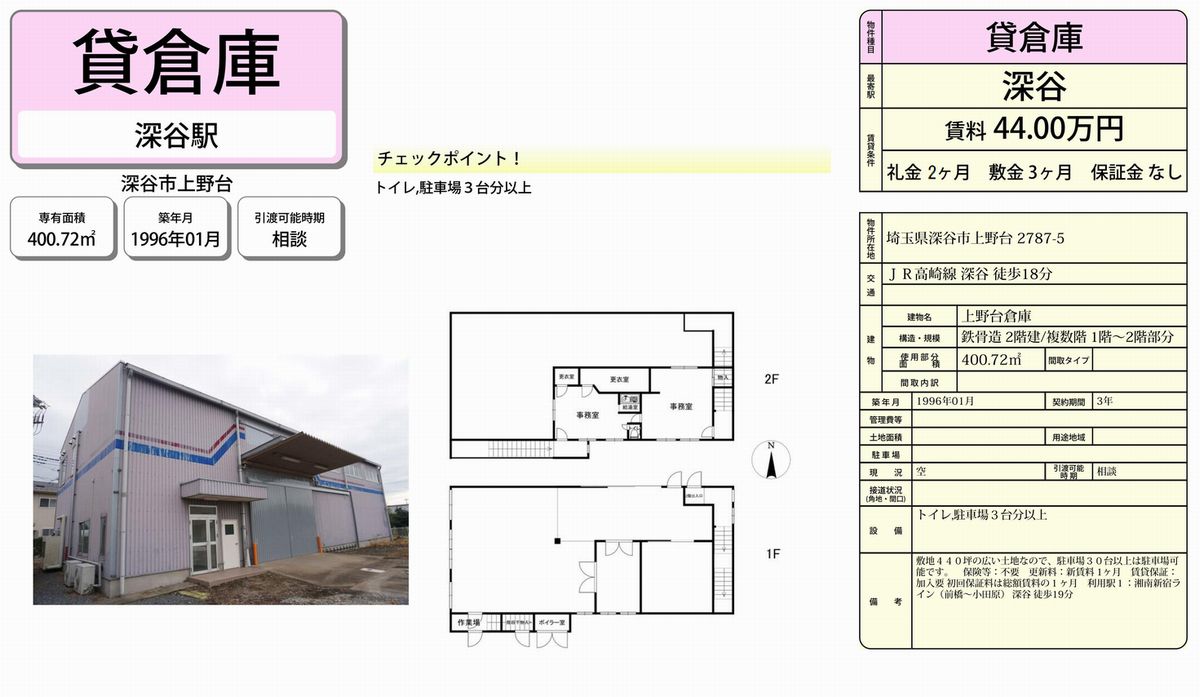 埼玉県深谷市上野台2787-5の貸倉庫・貸工場・賃貸土地を探すなら中小企業を応援する埼玉貸倉庫.comでニーズに合った物件を検索してください。埼玉県深谷市上野台2787-5の事務所付貸倉庫、クレーン付、店舗倉庫、工業専用地域等、何なりと営業担当者にお申し付けください。その他、埼玉県深谷市上野台2787-5の貸し倉庫・貸し工場・賃貸土地を貸したい方には無料にて査定・掲載いたしますので当社のオーナーサポートシステムをご利用ください。埼玉県深谷市上野台2787-5で貸倉庫・貸工場・賃貸土地を契約のテナント様には貸し倉庫・貸し工場の設計変更、造作のご相談も承ります。貸倉庫・貸工場・賃貸土地の移転・新規開設は埼玉エリア最大級、新着情報満載、埼玉貸倉庫.com! |