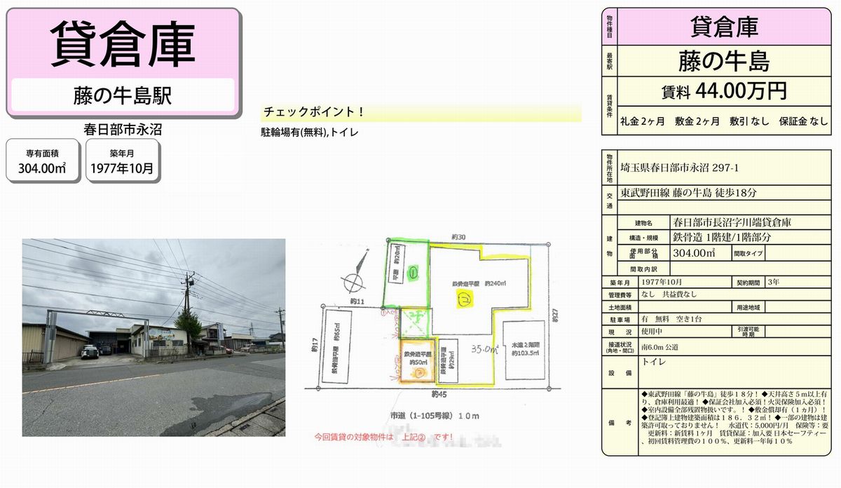 埼玉県春日部市永沼297-1の貸倉庫・貸工場・賃貸土地を探すなら中小企業を応援する埼玉貸倉庫.comでニーズに合った物件を検索してください。埼玉県春日部市永沼297-1の事務所付貸倉庫、クレーン付、店舗倉庫、工業専用地域等、何なりと営業担当者にお申し付けください。その他、埼玉県春日部市永沼297-1の貸し倉庫・貸し工場・賃貸土地を貸したい方には無料にて査定・掲載いたしますので当社のオーナーサポートシステムをご利用ください。埼玉県春日部市永沼297-1で貸倉庫・貸工場・賃貸土地を契約のテナント様には貸し倉庫・貸し工場の設計変更、造作のご相談も承ります。貸倉庫・貸工場・賃貸土地の移転・新規開設は埼玉エリア最大級、新着情報満載、埼玉貸倉庫.com!