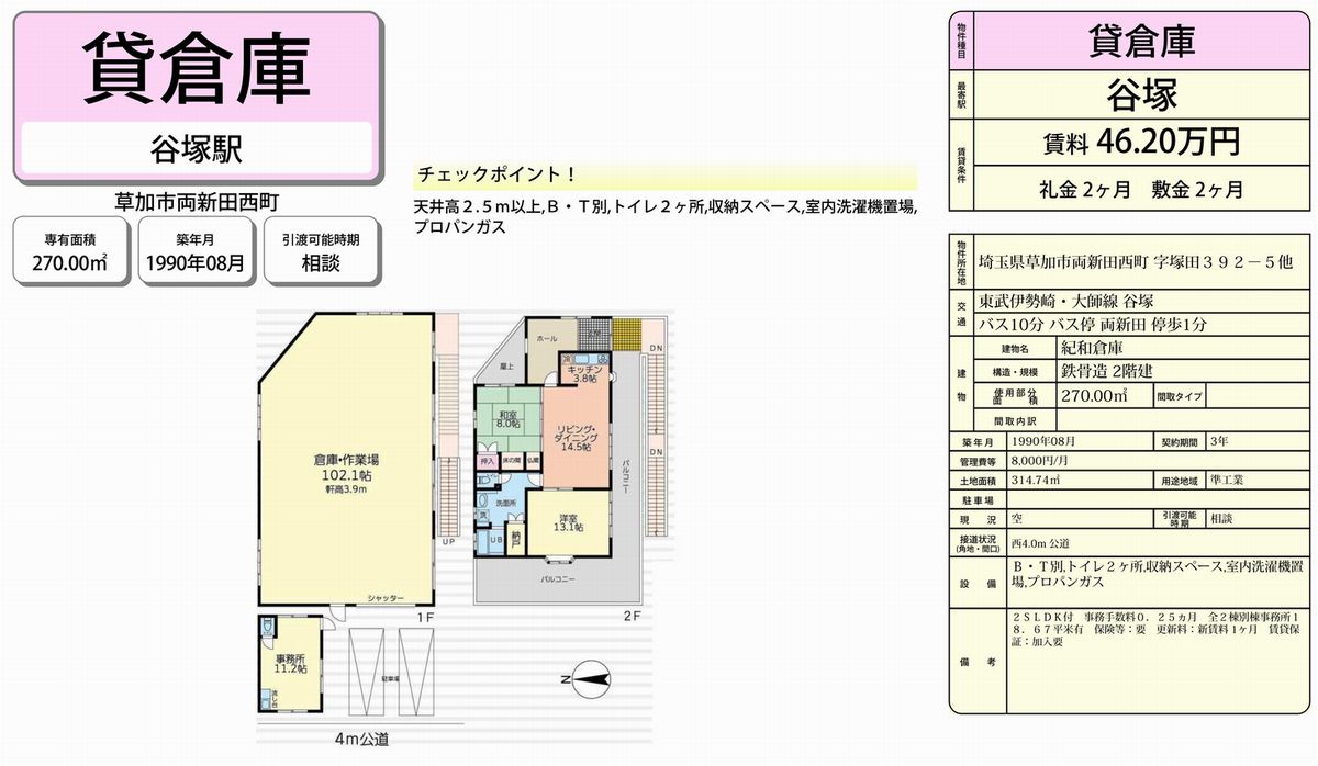 埼玉県草加市両新田西町392-5 (谷塚) 紀和倉庫 詳細データ
