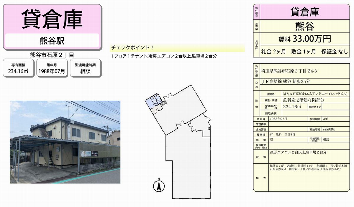 埼玉県熊谷市石原2-24-3の貸倉庫・貸工場・賃貸土地を探すなら中小企業を応援する埼玉貸倉庫.comでニーズに合った物件を検索してください。埼玉県熊谷市石原2-24-3の事務所付貸倉庫、クレーン付、店舗倉庫、工業専用地域等、何なりと営業担当者にお申し付けください。その他、埼玉県熊谷市石原2-24-3の貸し倉庫・貸し工場・賃貸土地を貸したい方には無料にて査定・掲載いたしますので当社のオーナーサポートシステムをご利用ください。埼玉県熊谷市石原2-24-3で貸倉庫・貸工場・賃貸土地を契約のテナント様には貸し倉庫・貸し工場の設計変更、造作のご相談も承ります。貸倉庫・貸工場・賃貸土地の移転・新規開設は埼玉エリア最大級、新着情報満載、埼玉貸倉庫.com! |