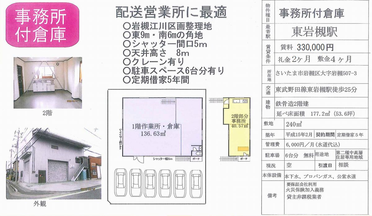 埼玉県さいたま市岩槻区大字岩槻507-3 (東岩槻) 東岩槻 倉庫 詳細データ