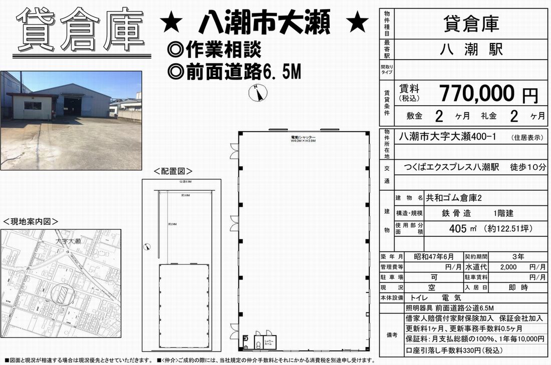 | 備考 | 電動シャッター トイレ 電気 駐車スペース有 |