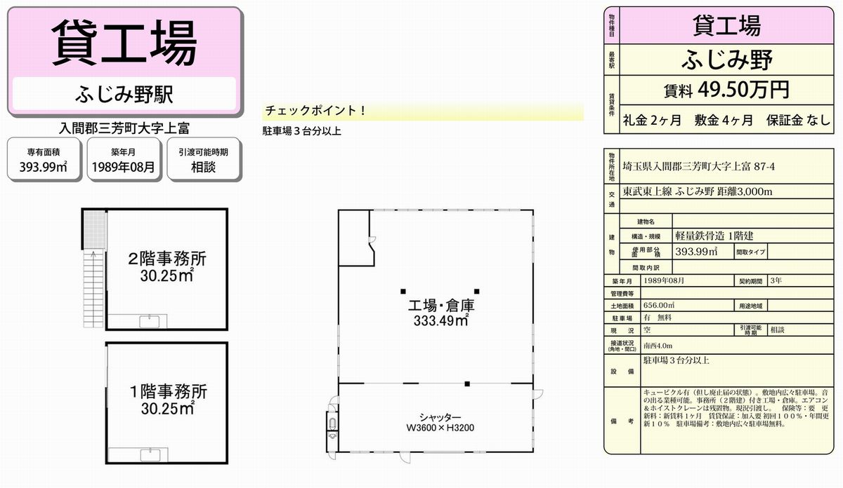 埼玉県入間郡三芳町上富87-4の貸倉庫・貸工場・賃貸土地を探すなら中小企業を応援する埼玉貸倉庫.comでニーズに合った物件を検索してください。埼玉県入間郡三芳町上富87-4の事務所付貸倉庫、クレーン付、店舗倉庫、工業専用地域等、何なりと営業担当者にお申し付けください。その他、埼玉県入間郡三芳町上富87-4の貸し倉庫・貸し工場・賃貸土地を貸したい方には無料にて査定・掲載いたしますので当社のオーナーサポートシステムをご利用ください。埼玉県入間郡三芳町上富87-4で貸倉庫・貸工場・賃貸土地を契約のテナント様には貸し倉庫・貸し工場の設計変更、造作のご相談も承ります。貸倉庫・貸工場・賃貸土地の移転・新規開設は埼玉エリア最大級、新着情報満載、埼玉貸倉庫.com! |