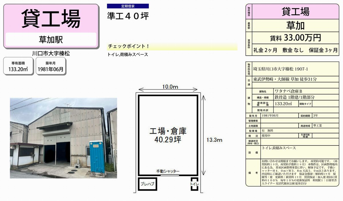 埼玉県川口市榛松1907-1 (草加) ワタナベ倉庫B 詳細データ