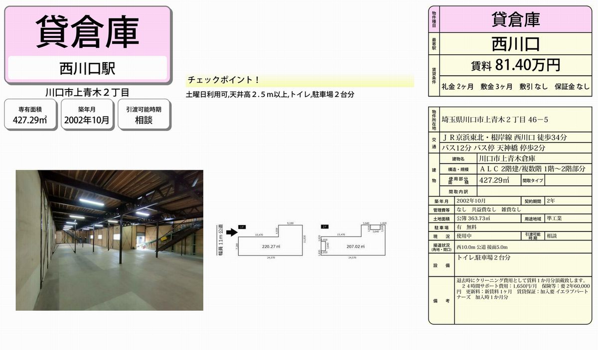 埼玉県川口市上青木2-46-5の貸倉庫・貸工場・賃貸土地を探すなら中小企業を応援する埼玉貸倉庫.comでニーズに合った物件を検索してください。埼玉県川口市上青木2-46-5の事務所付貸倉庫、クレーン付、店舗倉庫、工業専用地域等、何なりと営業担当者にお申し付けください。その他、埼玉県川口市上青木2-46-5の貸し倉庫・貸し工場・賃貸土地を貸したい方には無料にて査定・掲載いたしますので当社のオーナーサポートシステムをご利用ください。埼玉県川口市上青木2-46-5で貸倉庫・貸工場・賃貸土地を契約のテナント様には貸し倉庫・貸し工場の設計変更、造作のご相談も承ります。貸倉庫・貸工場・賃貸土地の移転・新規開設は埼玉エリア最大級、新着情報満載、埼玉貸倉庫.com! |