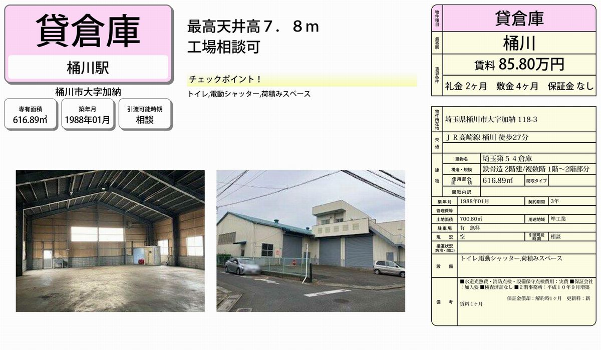 埼玉県桶川市加納118-3の貸倉庫・貸工場・賃貸土地を探すなら中小企業を応援する埼玉貸倉庫.comでニーズに合った物件を検索してください。埼玉県桶川市加納118-3の事務所付貸倉庫、クレーン付、店舗倉庫、工業専用地域等、何なりと営業担当者にお申し付けください。その他、埼玉県桶川市加納118-3の貸し倉庫・貸し工場・賃貸土地を貸したい方には無料にて査定・掲載いたしますので当社のオーナーサポートシステムをご利用ください。埼玉県桶川市加納118-3で貸倉庫・貸工場・賃貸土地を契約のテナント様には貸し倉庫・貸し工場の設計変更、造作のご相談も承ります。貸倉庫・貸工場・賃貸土地の移転・新規開設は埼玉エリア最大級、新着情報満載、埼玉貸倉庫.com! |