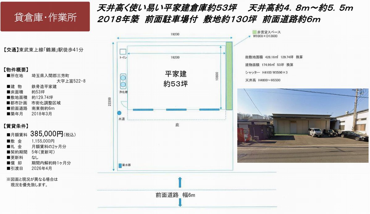 埼玉県入間郡三芳町大字上富522-8の貸倉庫・貸工場・賃貸土地を探すなら中小企業を応援する埼玉貸倉庫.comでニーズに合った物件を検索してください。埼玉県入間郡三芳町大字上富522-8の事務所付貸倉庫、クレーン付、店舗倉庫、工業専用地域等、何なりと営業担当者にお申し付けください。その他、埼玉県入間郡三芳町大字上富522-8の貸し倉庫・貸し工場・賃貸土地を貸したい方には無料にて査定・掲載いたしますので当社のオーナーサポートシステムをご利用ください。埼玉県入間郡三芳町大字上富522-8で貸倉庫・貸工場・賃貸土地を契約のテナント様には貸し倉庫・貸し工場の設計変更、造作のご相談も承ります。貸倉庫・貸工場・賃貸土地の移転・新規開設は埼玉エリア最大級、新着情報満載、埼玉貸倉庫.com! |
