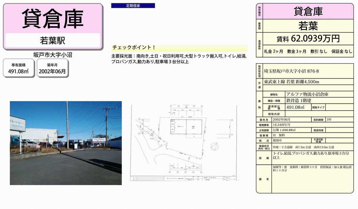 埼玉県坂戸市小沼876-8 (若葉) 若葉 倉庫 詳細データ