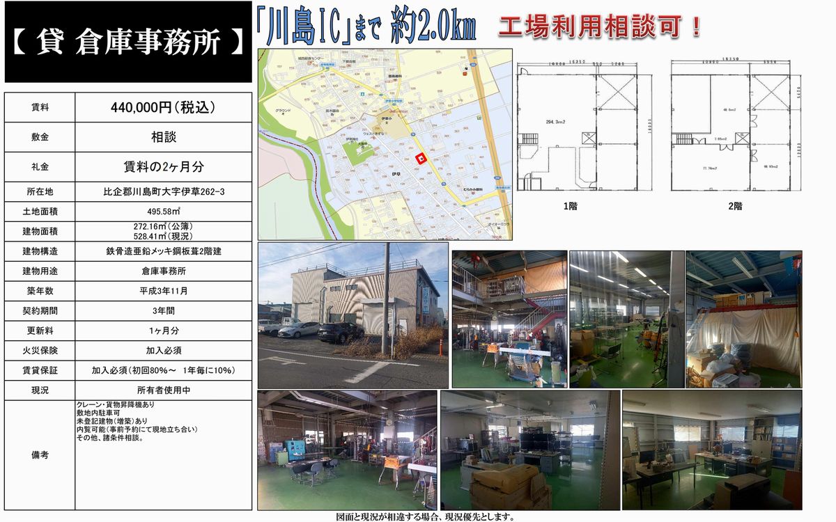 埼玉県比企郡川島町伊草262-3の貸倉庫・貸工場・賃貸土地を探すなら中小企業を応援する埼玉貸倉庫.comでニーズに合った物件を検索してください。埼玉県比企郡川島町伊草262-3の事務所付貸倉庫、クレーン付、店舗倉庫、工業専用地域等、何なりと営業担当者にお申し付けください。その他、埼玉県比企郡川島町伊草262-3の貸し倉庫・貸し工場・賃貸土地を貸したい方には無料にて査定・掲載いたしますので当社のオーナーサポートシステムをご利用ください。埼玉県比企郡川島町伊草262-3で貸倉庫・貸工場・賃貸土地を契約のテナント様には貸し倉庫・貸し工場の設計変更、造作のご相談も承ります。貸倉庫・貸工場・賃貸土地の移転・新規開設は埼玉エリア最大級、新着情報満載、埼玉貸倉庫.com!