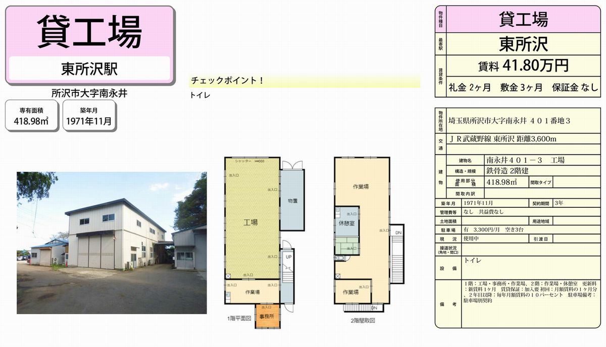 埼玉県所沢市大字南永井401-3 (東所沢) 東所沢 工場 詳細データ
