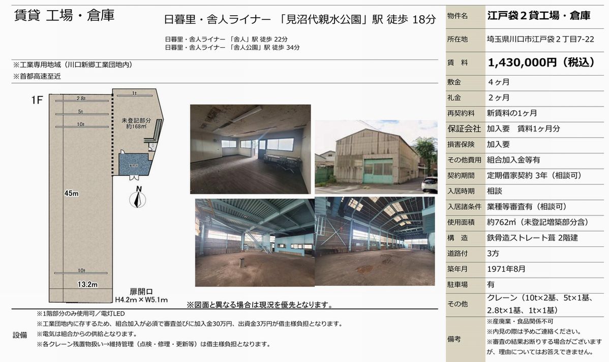 埼玉県川口市江戸袋2-7-22の貸倉庫・貸工場・賃貸土地を探すなら中小企業を応援する埼玉貸倉庫.comでニーズに合った物件を検索してください。埼玉県川口市江戸袋2-7-22の事務所付貸倉庫、クレーン付、店舗倉庫、工業専用地域等、何なりと営業担当者にお申し付けください。その他、埼玉県川口市江戸袋2-7-22の貸し倉庫・貸し工場・賃貸土地を貸したい方には無料にて査定・掲載いたしますので当社のオーナーサポートシステムをご利用ください。埼玉県川口市江戸袋2-7-22で貸倉庫・貸工場・賃貸土地を契約のテナント様には貸し倉庫・貸し工場の設計変更、造作のご相談も承ります。貸倉庫・貸工場・賃貸土地の移転・新規開設は埼玉エリア最大級、新着情報満載、埼玉貸倉庫.com! |
