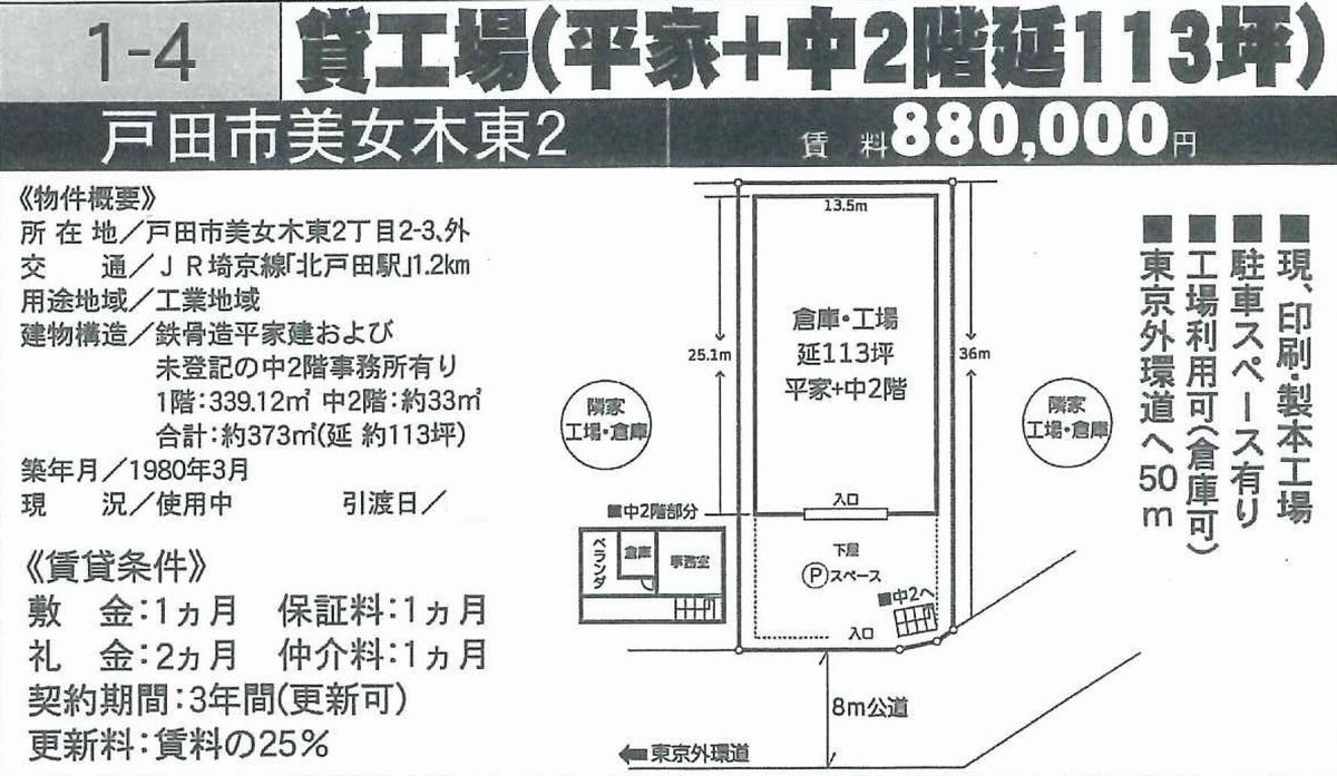 埼玉県戸田市美女木東2-2-3の貸倉庫・貸工場・賃貸土地を探すなら中小企業を応援する埼玉貸倉庫.comでニーズに合った物件を検索してください。埼玉県戸田市美女木東2-2-3の事務所付貸倉庫、クレーン付、店舗倉庫、工業専用地域等、何なりと営業担当者にお申し付けください。その他、埼玉県戸田市美女木東2-2-3の貸し倉庫・貸し工場・賃貸土地を貸したい方には無料にて査定・掲載いたしますので当社のオーナーサポートシステムをご利用ください。埼玉県戸田市美女木東2-2-3で貸倉庫・貸工場・賃貸土地を契約のテナント様には貸し倉庫・貸し工場の設計変更、造作のご相談も承ります。貸倉庫・貸工場・賃貸土地の移転・新規開設は埼玉エリア最大級、新着情報満載、埼玉貸倉庫.com! |