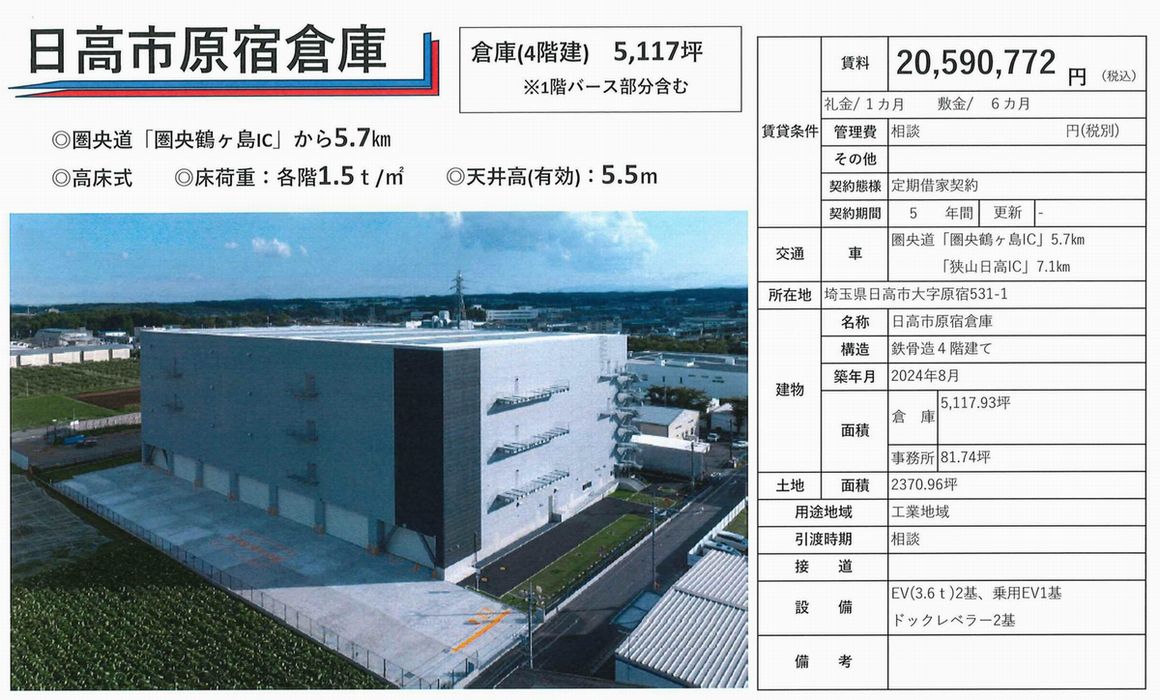 埼玉県日高市原宿531の貸倉庫・貸工場・賃貸土地を探すなら中小企業を応援する埼玉貸倉庫.comでニーズに合った物件を検索してください。埼玉県日高市原宿531の事務所付貸倉庫、クレーン付、店舗倉庫、工業専用地域等、何なりと営業担当者にお申し付けください。その他、埼玉県日高市原宿531の貸し倉庫・貸し工場・賃貸土地を貸したい方には無料にて査定・掲載いたしますので当社のオーナーサポートシステムをご利用ください。埼玉県日高市原宿531で貸倉庫・貸工場・賃貸土地を契約のテナント様には貸し倉庫・貸し工場の設計変更、造作のご相談も承ります。貸倉庫・貸工場・賃貸土地の移転・新規開設は埼玉エリア最大級、新着情報満載、埼玉貸倉庫.com! |