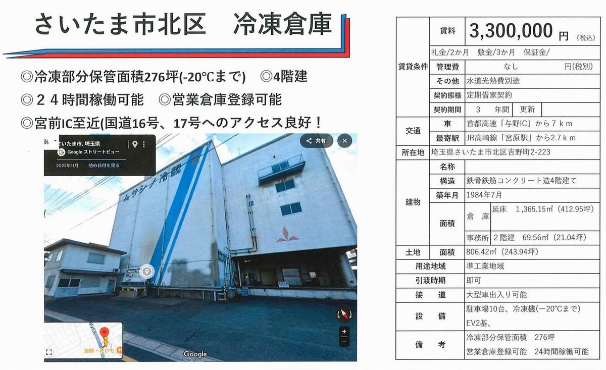 埼玉県さいたま市北区吉野町2-223の貸倉庫・貸工場・賃貸土地を探すなら中小企業を応援する埼玉貸倉庫.comでニーズに合った物件を検索してください。埼玉県さいたま市北区吉野町2-223の事務所付貸倉庫、クレーン付、店舗倉庫、工業専用地域等、何なりと営業担当者にお申し付けください。その他、埼玉県さいたま市北区吉野町2-223の貸し倉庫・貸し工場・賃貸土地を貸したい方には無料にて査定・掲載いたしますので当社のオーナーサポートシステムをご利用ください。埼玉県さいたま市北区吉野町2-223で貸倉庫・貸工場・賃貸土地を契約のテナント様には貸し倉庫・貸し工場の設計変更、造作のご相談も承ります。貸倉庫・貸工場・賃貸土地の移転・新規開設は埼玉エリア最大級、新着情報満載、埼玉貸倉庫.com!