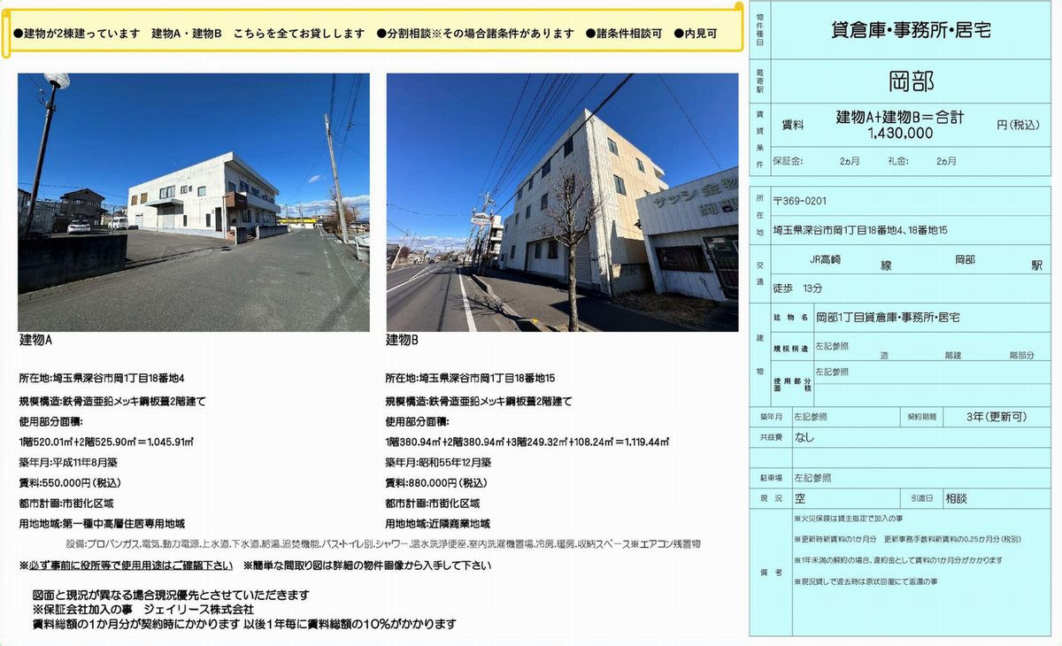 埼玉県深谷市岡1-18-4 (岡部) 岡部 倉庫 2棟一括貸 詳細データ