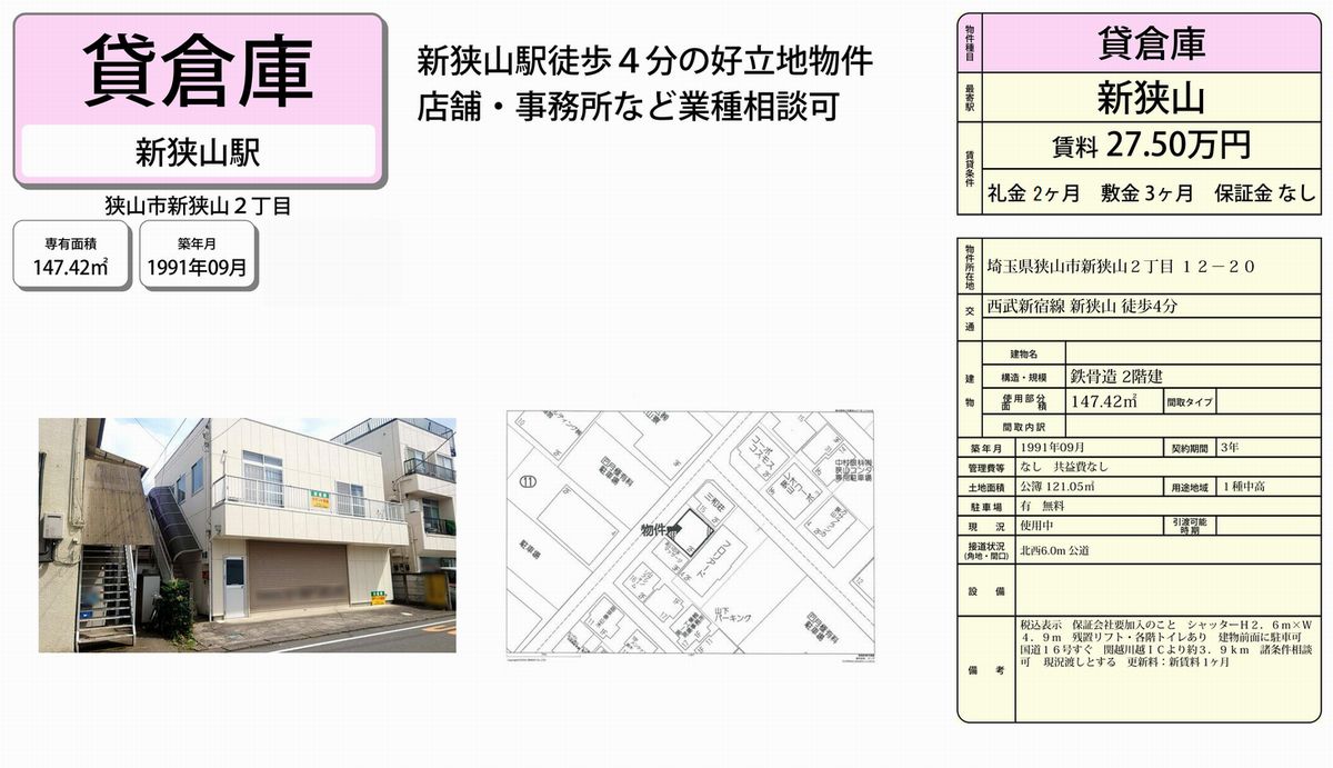 埼玉県狭山市新狭山2-12-20 (新狭山) 新狭山 倉庫 詳細データ