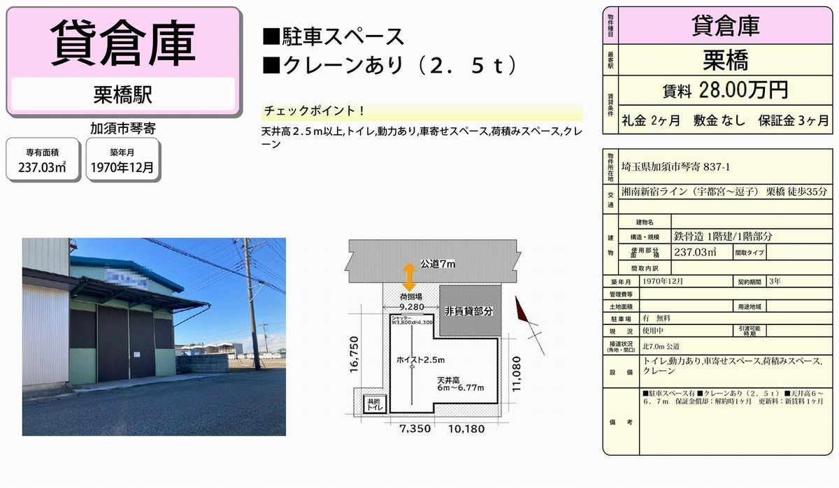 埼玉県加須市琴寄837-1 (栗橋) 栗橋 倉庫 詳細データ