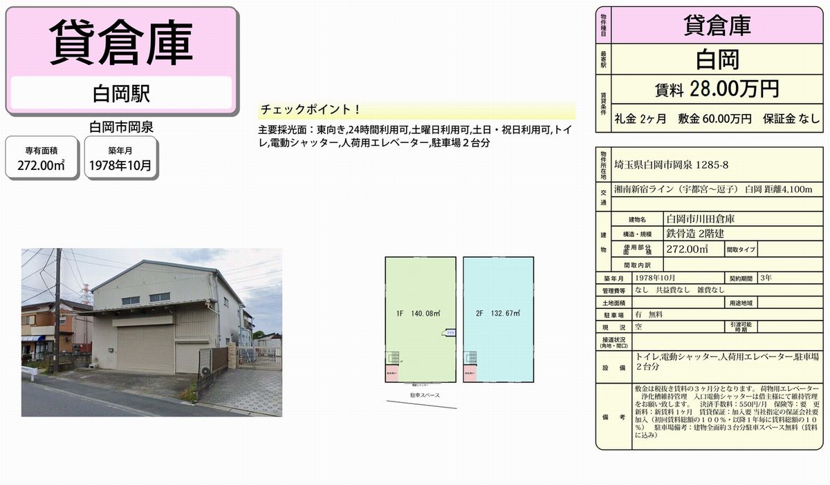 埼玉県白岡市岡泉1285-8 (白岡) 川田倉庫 詳細データ