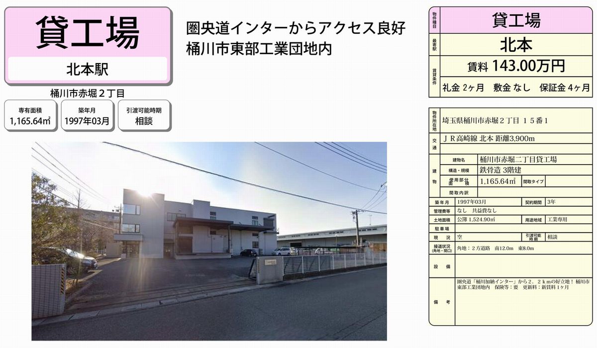 桶川市赤堀2-15-1(北本駅)北本 工場