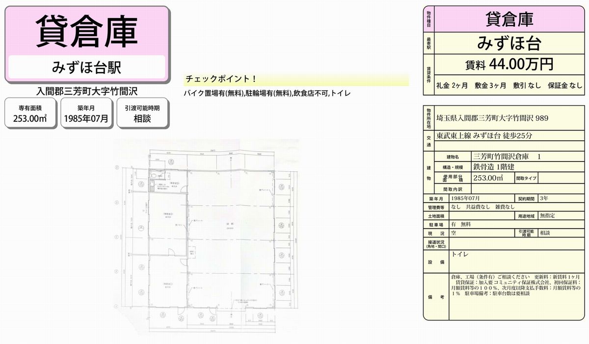 埼玉県入間郡三芳町竹間沢989 (みずほ台) みずほ台 倉庫 詳細データ
